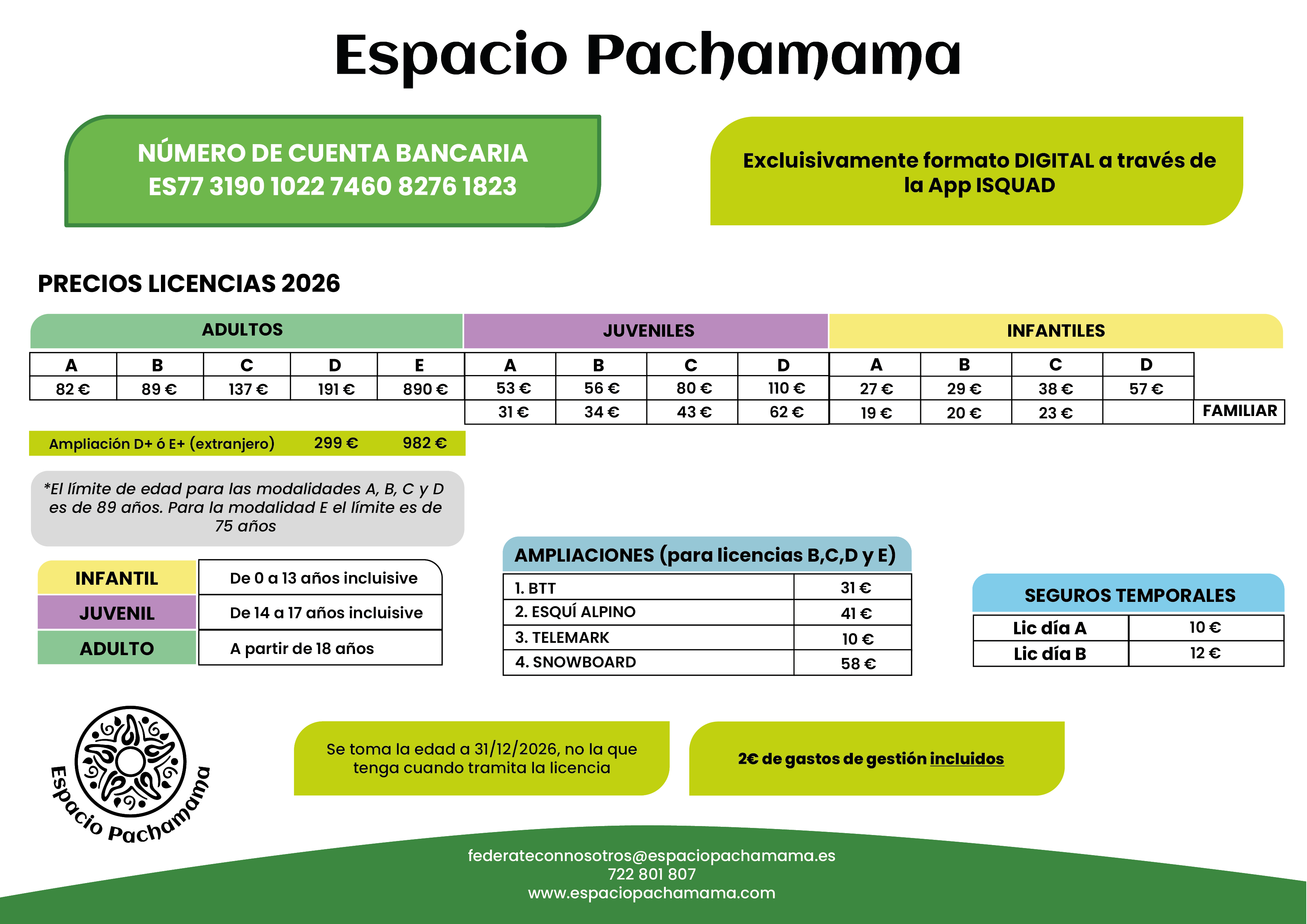 Espacio Pachamama te lo pone fácil. No te cobramos la cuota de socio y tampoco es necesario que seas cliente del Espacio para federarte con nosotros. Tan solo tienes que abonar la ficha federativa: elige la modalidad, realiza el ingreso y adjunta el justificante junto con el nombre y apellidos, el DNI y la fecha de nacimiento. Tienes el formulario de envío a continuación.